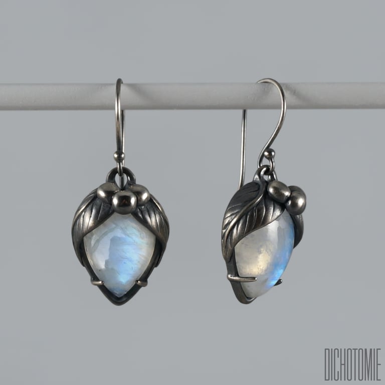 Wear La Belladonna Earring set as protection against negative or poisonous energies by harnessing the qualities of the deadly nightshade plant. Each earring features a trio of nightshade berries and double leaves that gracefully hug a Rainbow Moonstone cabochon. Earring set is cast in sterling silver and hangs from sterling silver ear wire.