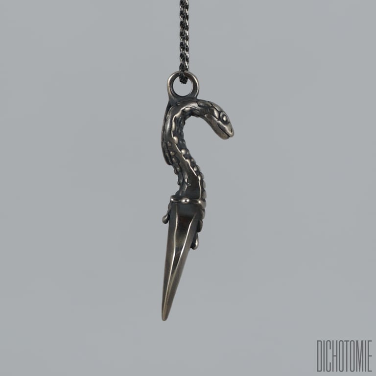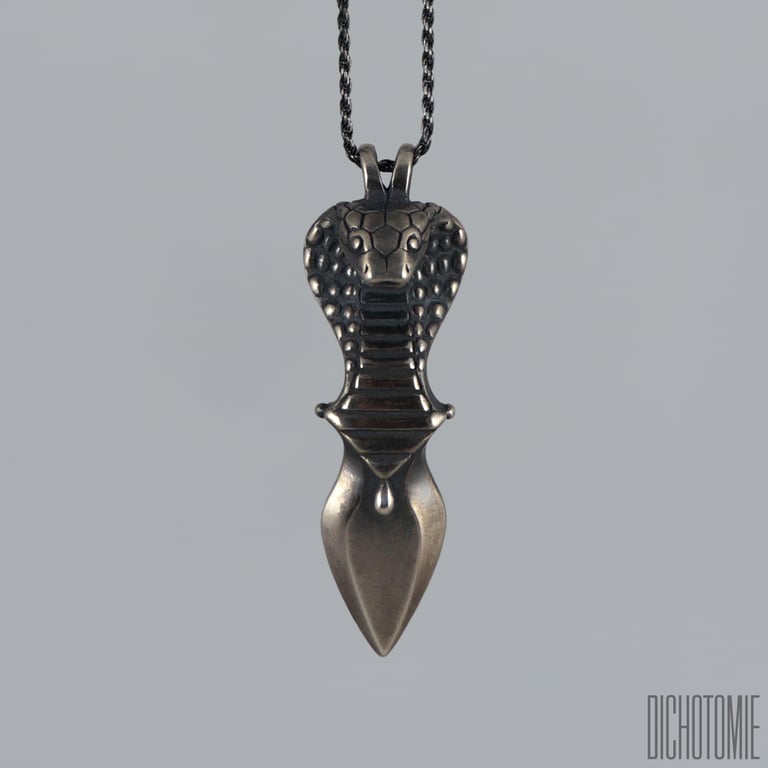 Choose The Venenum Pendant as an amulet of protection against harmful situations. Harness the guardianship of a cobra combined with a ceremonial blade, giving the wearer courage to sever ties from negative thoughts or circumstances which do not serve them anymore. A single droplet of venom on the front of the design yields powerful protection via its namesake, Venenum, literally translating to ‘venom’ in Latin.